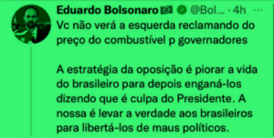 7 – Você não verá os numerados filhos do MitÔ reclamando do preço do combustível imposto pela Petrobras. A estratégia bolsonária é piorar a vida do brasileiro – aumento da inflação, da violência, da insegurança – dizendo que é herança dos governos comunistas de antes.