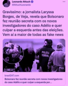 – Interessante é que existe um inquérito instaurado pelo supremo Alexandre de Moraes correndo na PF exatamente pra investigar interferência do MitÔ na dita cuja PF… que foi prorrogado pela 5ª vez. As instituições estão funcionando sim… para eles!