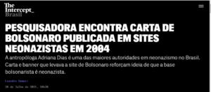 3 – Viraliza nas redes uma notícia do Intercept de julho/21: “Pesquisadora encontra carta de Bolsonaro publicada em sites neonazistas em 2004”. A esta altura, alguém ainda tem dúvidas de que o MitÔ é nazista? Quem ainda o segue tem a mesma crença… e não vai mudar!