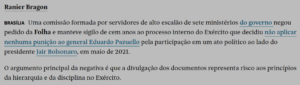 – Ou seja: o comandante do Exército obedeceu uma ordem do chefão maior, o MitÔ, e isto pode levar à desobediência e à indisciplina entre os militares? E por isso, a matéria torna-se sigilenta por 100 anos? Belo Exército nós temos…!
