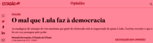 9 – Qual é a razão real pro ódio que os barões da imprensa corporativa devotam a Lula? Mesquitas, Frias, Marinhos, Macedos, Sayads têm medo de que? Regulamentação da mídia é o que está por trás do petismo. Sem ela, eles criam narrativas que lhes interessam… e mandam!