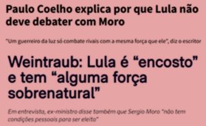 – Não estou gostando nem um pouco, pois, das palavras sobre Lula de duas figuras opostas em tudo: Paulo Coelho diz que um “guerreiro da Luz só combate rivais com a mesma força que ele”, e Abraham Weitraub diz que Lula “não é deste mundo, ele tem alguma força sobrenatural…”
