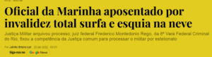 3 – Não tem como, mas o Brasil é, realmente, o país da picaretagem! Um oficial da Marinha, aposentado por invalidez total, posta fotos em suas redes surfando e esquiando na neve. Claro que foi denunciado, mas a Justiça Militar arquivou o caso e mandou pra Justiça Civil.