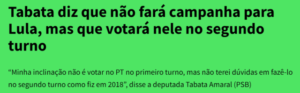 7 – Vamos supor que o ex-tucano Alkmim se filie ao PSB e saia candidato a vice de Lula. A deputada Tábata, que saiu do PDT pro PSB, não fará campanha pra eles no 1º turno? Ou só fará se for liberada pra tal pelo Lehman? E pensar que muita gente tinha esperança nos jovens na política?