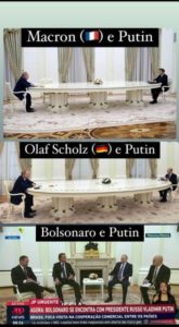 7 – Bolsonários vibram e publicam fotos comparativas das visitas de Olaf Scholz, premiê da Alemanha e do Mitô ao czar Putin. Quase têm orgasmos com o “prestígio” do capitão… Não é prestígio não, gente. Scholz recusou-se a passar pelo teste de covid, o Mitô não!