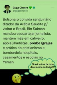 – E Guga Chacra, nas redes, escreve que o MitÔ convidou o príncipe saudita, que comete alguns crimes bárbaros, mas não faz qualquer crítica ao MitÔ por esta atitude… O povo entenderia o recado se ele escrevesse: “Bolsonaro gosta de ditadores sanguinários” em seu post…