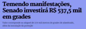 – Abriu um pregão eletrônico pra locação de 270 mil metros de grade de alambrado no valor de R$537,5 mil pra proteger a Polícia Legislativa e os nobres parlamentares de protestos do povo… Enfim, a Casa passará a ser deles, só deles!