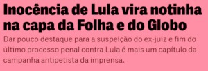 3 – Esta semana o 24° e último processo instaurado pela Lava Jato contra Lula foi suspenso e também será arquivado como os demais. Globo e Folha deram a notícia… bem escondidinha. Muita gente boa acha que é consequência do antipetismo da grande imprensa.