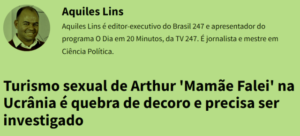 – Num áudio vazado, ele fala prum amigo de sua real missão numa zona de guerra: ‘as ‘mina’, cara! Tudo fácil! Estou chocado.’ Chocados ficaram todos: namorada, colegas, mulheres do Partido, Moro… Só agora descobriram a merda com quem conviviam? Que queriam como governador?