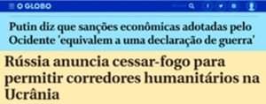8 – Pois é… a guerra do outro lado do Atlântico tomou conta de tudo. Acabou a pandemia, os mortos de Petrópolis já foram enterrados, nos cemitérios ou na lama dos desmoronamentos e nem há desemprego e fome no Brasil. Que bom que esta guerra bombou, né mesm…?