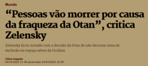 7 – O presidente Zelenski, novo herói da mídia ocidental, deu declaração bombástica de novo, responsabilizando a OTAN pela morte de pessoas inocentes. A OTAN é responsável por milhares de mortes, mas não está sozinha nesta guerra: Zelenski é tão culpado por elas quanto Putin.