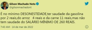 – Ele não é burro e sabe que a política de aumento do salário mínimo da era lulista foi alterada quando Dilma foi golpeada e o reajuste, há 02 anos, acompanha apenas o valor da inflação. Isto não acontece com a gasolina… com o arroz… com a carne… com as viagens…