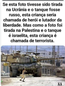 – Qual a diferença entre um ucraniano e um palestino que luta contra um país invasor? Para o Ocidente só uma: primeiro é herói… o segundo é terrorista.