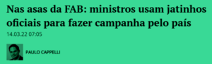 – Alguma instituição brasileira que fiscaliza os gastos públicos faz alguma coisa? O cara é ministro e marca 05, 10, 15 viagnes “à serviço” para seu Estado, onde aproveita para fazer campanha para sua reeleição… e ninguém diz nada? Viva o Brasil!