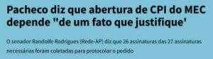 – E o ‘mineiroso’ presidente do Senado diz que CPI do MEC “depende de um fato que a justifique”. Como na CPI da Pandemia, ele está enrolando. Não vai aprova-la a não ser que o STF exija. Mineiros já foram menos cagões… Assim como Minas já foi!