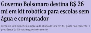 – As escolas beneficiadas não tem computadores nem Internet… e, muitas vezes, nem salas suficientes ou água encanada. Os kits enfeitarão um pedestal na sala da diretora, com uma placa indicando: cortesia do deputado Arthur Lira. Alguma novidade nisto?