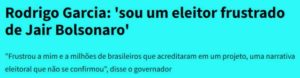 7 – Rodrigo Garcia, atual governador de e candidato à reeleição em São Paulo, é político tradicional, que conhece as mumunhas e mutretas parlamentares. Dizer agora que Bolsonaro frustrou ele e “milhões de brasileiros que acreditaram em um projeto”, pega mal pra ele.