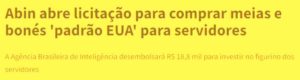 – É que a ABIN está comprando 53 bonés, a R$185,00 cada, e 165 pares de meia preta militar de cano longo para coturno, a R$54,00 cada, tudo no padrão USA Army… Será uma compensação por não terem recebido viagra, botox e gel lubrificante íntimo?