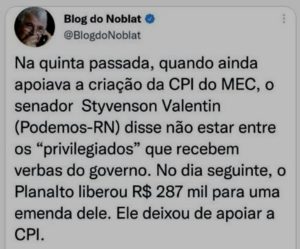 – Rapidinho, o Planalto liberou uma emenda dele no valor de R$287 mil… e, mais rapidinho ainda, ele retirou sua assinatura para instalação da CPI do MEC. Na avaliação de vocês trata-se de uma negociação política ou de chantagem mesmo?