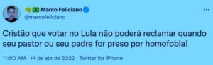 3 – Marco Feliciano faz ameaça aos fiéis, predizendo que Lula eleito, prenderá padres e pastores homofóbicos. Ele sabe que homofobia é crime, punido pelas leis brasileiras. Mas eu acho que ele quer ir além: ele quer avisar seus pares que as leis voltarão a ser cumpridas no Brasil de Lula.