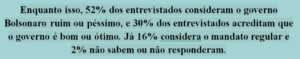 6 – Taí uma pergunta que eu gostaria que os institutos de pesquisa fizessem quando sondam a preferência dos eleitores para presidente da República. Na última, da XP-Ipespe, 30% dos entrevistados consideraram o governo do MitÔ bom ou ótimo… Por quê?, eu perguntaria…