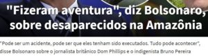 9 – O MitÔ disse que o indigenista e o jornalista estavam numa aventura perigosa na Amazônia. Na Amazônia atual tudo é perigoso! Há pesca ilegal, há garimpo ilegal, há corte ilegal de árvores, há incêndios ilegais, há estupros e assassinatos amorais e sem qualquer punição…