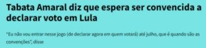 3 – Tábata Amaral não declara voto no 1° turno, e espera os projetos pra educação de Lula pra talvez votar nele, caso haja 2° turno. Lula já governou 08 anos e, nestes anos, aprovou o FUNDEB, destinou dinheiro do pré sal para educação, criou 18 universidades e 178 câmpus…