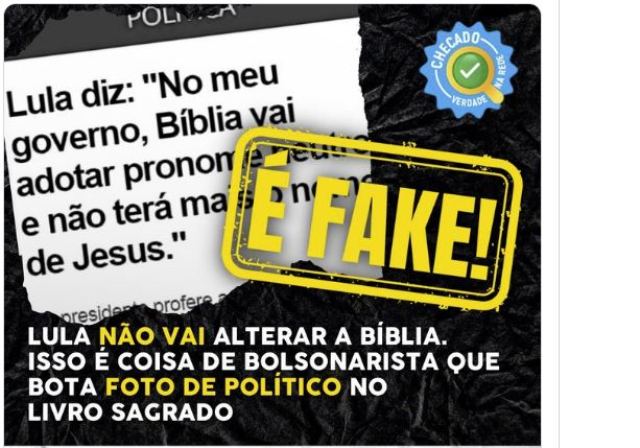 7 – Uma das fake News que circulam pelas redes diz que Lula vai alterar a Bíblia. Eu recebi a dita cuja de um barbeiro aqui da região, que está tentando montar sua igreja neo pentecostal. Respondi perguntando-lhe se um “diabo comunista” como Lula podia mudar a Bíblia Sagrada…