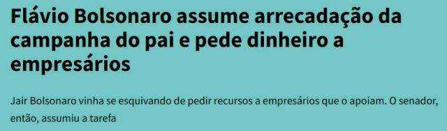 6 – A campanha dos candidatos às eleições é bancada por aqueles bilhões do Orçamento que os parlamentares aprovaram “em nome da democracia” e por contribuições pessoais de barões e baronetes. Aí, o 001 assumiu a tarefa de arrecadar dinheiro pra campanha do MitÔ…