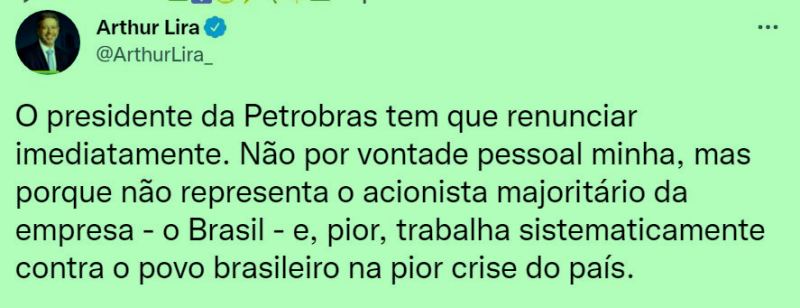 – Aprovaram, então, a Lei das Estatais, que dá autonomia aos dirigentes para gerirem estas empresas, sem interferência política do Estado. Mandando de novo no governo, Arthur Lira diz que o presidente da Petrobras é inimiga do povo… Deve ter um amigo pra colocar no lugar!
