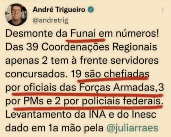 – O resultado é óbvio: FUNAI, IBAMA e ICMBio sucateados, madeireiras, mineradoras, garimpeiros, pescadoras ilegais, traficantes, milícias de todos os tipos governando partes do país… e mortes, muitas mortes sem mandantes…