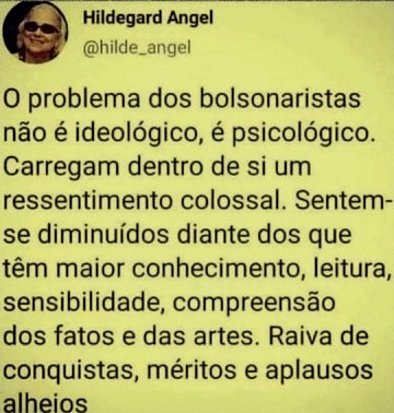 - Eu tendo a concordar com a Hildegard, mas reconheço que há bolsonaristas que fogem deste perfil psicológico. Conheço uns, aliás. Um acredita que o brasileiro é preguiçoso e só trabalha com feitor. Outro acha que é tudo ladrão e só com ditadura o Brasil pode ir pra frente.