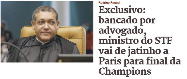 – Além de desconhecer a Constituição, provou que ilibada reputação é babaquice. Como bom baronete, mês passado “deu um pulo” a Paris pra assistir partidas de futebol e tênis e corrida de Fórmula 1, tudo pago por um advogado com ações na Suprema Corte.