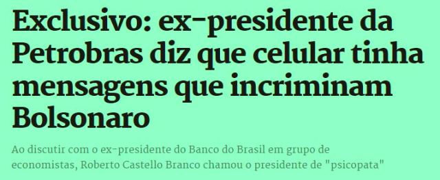 7 – Castelo Branco, o 1º presidente da Petrobras no governo do MitÔ, tempos depois de ser demitido por ele, postou num grupo de Whats’App: “No meu celular corporativo tinha mensagens e áudios que poderiam incriminá-lo. Fiz questão de devolver intacto para a Petrobras”.
