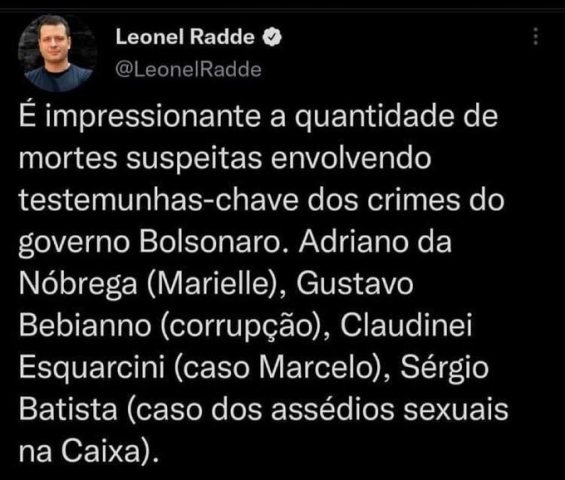 – Dizem que a história se repete como farsa. Neste mês, 02 personagens ligados a fatos escabrosos do governo bolsdonário, o assassinato do petista Marcelo Arruda e as denúncias de assédio sexual e moral do ex presidente da Caixa, também se suicidaram segundo a policia.