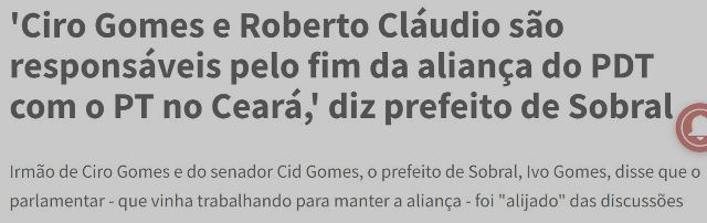 9 – Alguma coisa acontece nas esquinas do Sobral. O prefeito Ivo Gomes, irmão do Ciro, diz que este e o escolhido para disputar o governo pelo PDT são os responsáveis pelo rompimento da aliança do partido com o PT, que já durava 16 anos.
