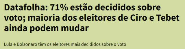 7 – Segundo o Datafolha, 111 milhões de eleitores brasileiros (71%) já decidiram em quem vão votar em outubro. E, do total de eleitores (156 milhões), 73,3 milhões (47%) declaram voto em Lula. Se não acontecer um cataclisma, Lula assume o poder em 2023.