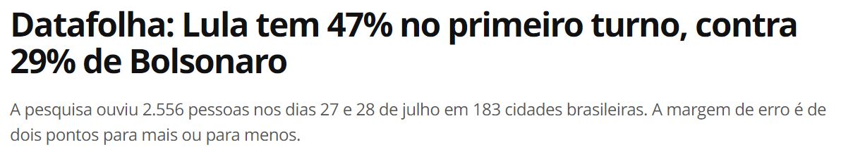 – O fato concreto é que as pesquisas eleitorais mais confiáveis indicam que há total estabilidade dos resultados, Lula podendo ganhar no 1° turno. E é óbvio que o Brasil precisa disto: uma vitória acachapante da democracia no 1º turno!