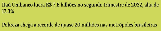 9 – Deveria ser motivo de extrema vergonha para autoridades constituídas lerem nos jornais de hoje que: 1. Itaú Unibanco lucra R$ 7,6 bilhões no 2º trimestre de 2022, e 2. Pobreza chega a recorde de quase 20 milhões nas metrópoles brasileiras. Não é! Elas se lixam pro país e pro povo!