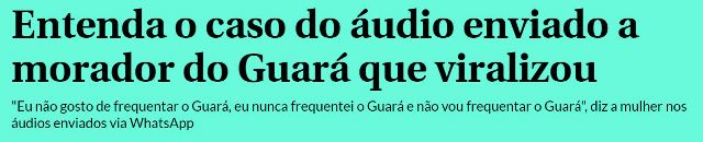 – Esta polêmica causada pela “riquinha” que se recusou a encontrar um guaraense, postando nas redes que “nós somos de níveis sociais completamente diferentes, eu não gosto de frequentar o Guará, nunca frequentei o Guará, não vou frequentar o Guará” revoltou o Guará.