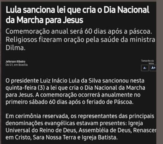 7 – Em setembro de 2009, na presença das principais lideranças evangélicas, Lula sancionou a lei que criou o Dia Nacional da Marcha para Jesus, de autoria do bispo Crivella. Em pouco tempo, bispos e pastores perceberam que não bastava a lei… era preciso bufunfa pra tocar a Marcha.