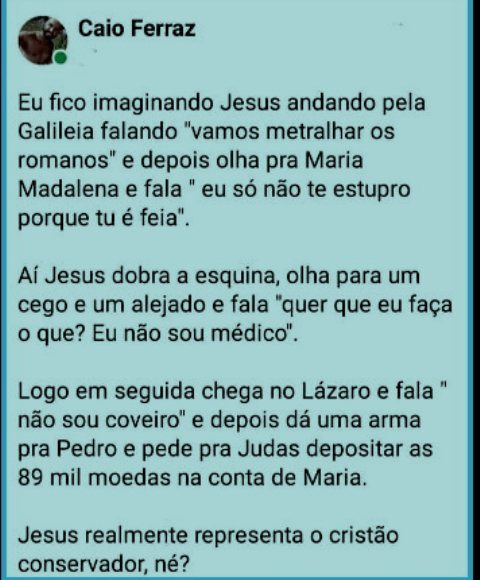 7 – Segundo os cânones católicos, Jesus viveu há 2022 anos. Filho de Deus e da Virgem Maria, pregou o amor, a paz e a adoração ao Pai. Bem diferente do que pregam os pastores da Teologia da Prosperidade. O Cristo deles é outro, um que enche seus bolsos de grana, amém!