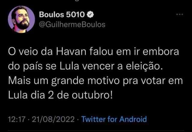 9 – Discordo do Boulos em parte. Na situação que o país chegou, qualquer motivo é um bom motivo pra votar em Lula. Mas devemos evitar que o Véi da Havan embarque em um de seus jatos particulares e fuja do Brasil. Ele deve as cuecas de impostos ao país e precisa quitá-los.