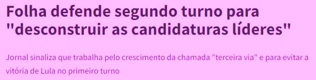 5 – Qual é o medo de Marinhos, Mesquitas e Frias? Que Lula, eleito no 1º turno, se mostre forte o suficiente pra propor a regulamentação da Mídia, algo que já existe no mundo desenvolvido? E, conseguindo levar pro 2º turno, eles continuarão dando as cartas?