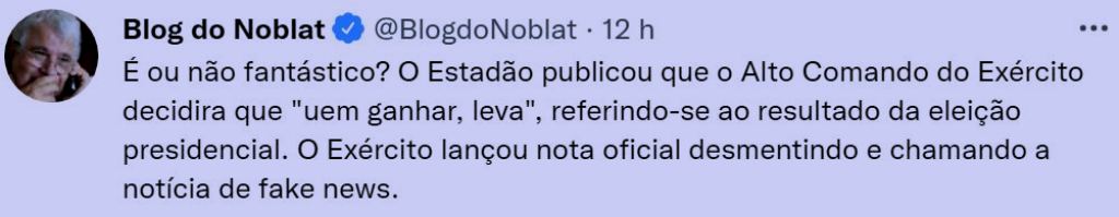 – Aí o Estadão noticia que o Exército soltou nota garantindo as eleições e a posse de quem ganhar… e o Exército solta nota dizendo que tal nota é fake news! Ameaça sutil?