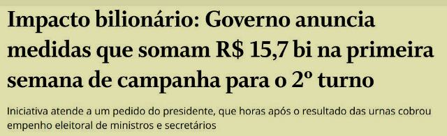 – A gastança, claro, é pra turbinar os votos bolsonários no 2º turno, mas para isto não tem importância… o que importa é não furar o teto liberando recursos para educação, saúde, habitação, Bolsa Família, deficientes, vacinação…