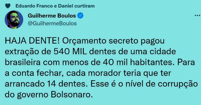 7 – Há muitas formas de se roubar o Brasil. E boa parte via orçamento secreto ou emendas parlamentares ou fundo eleitoral. Uma fatura, por exemplo, significou que todos os cidadãos, bebês inclusos, de pequena cidade do MA teriam extraído 06 dentes cada.