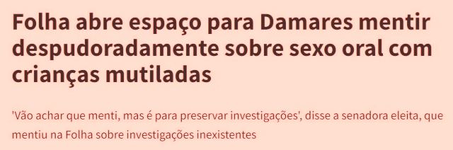 5 – Fato é fato: dona Damares, a Paranóica, disse uma mentira, algo que fez a vida inteira. Desta vez, ultrapassou todos os limites da decência humana, mas a ira e indignação que despertou, não a abalaram: insiste na mentira e diz que é pra proteger as investigações.