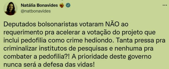 – Ontem, os bolsonaristas da Comissão de Constituição e Justiça da Câmara votaram contra requerimento pra acelerar a votação do projeto que torna pedofilia crime hediondo. Tudo a ver, não é mesm…?