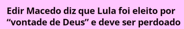 – No Instagram ele postou: “O diabo quer acabar com sua fé, com seu relacionamento com Deus por causa de Lula ou dos políticos.” Edir disse que orou pela vitória do presidente”, mas que a eleição de Lula foi uma escolha divina. Vão trocar o mito?